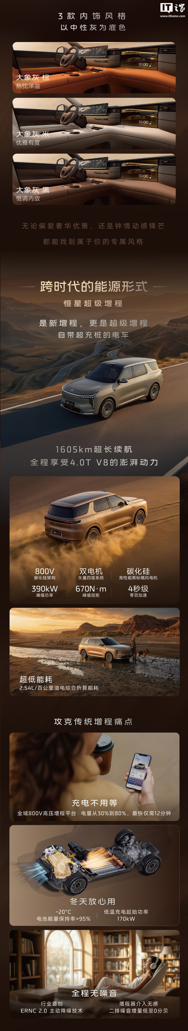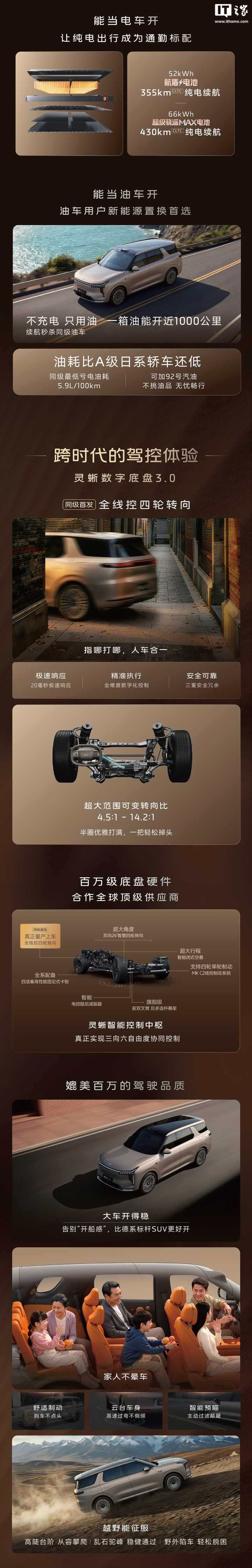 新车搭载1.5T“恒星”超级增程动力系统(增程器最大功率114千瓦),单电机后驱版综合最大功率230千瓦,最大扭矩430牛·米;双电机四驱版综合最大功率390千瓦,最大扭矩670牛·米。
