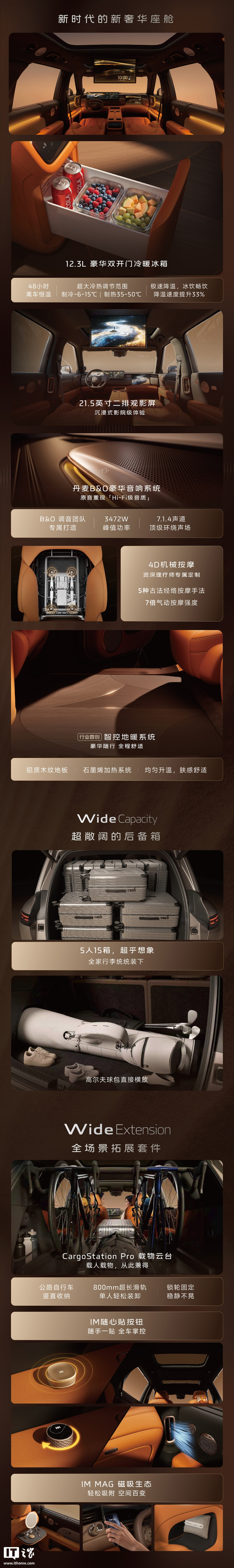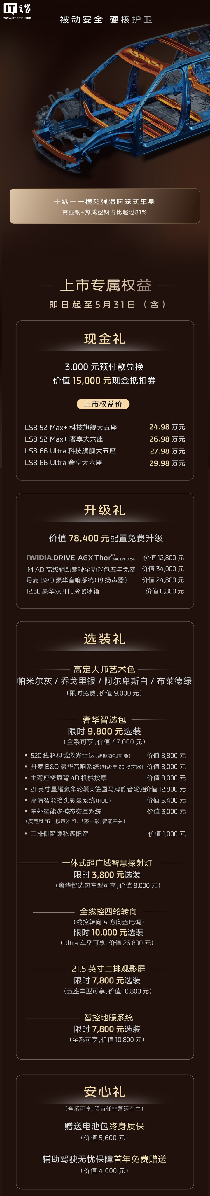 参考IT之家今日早些时候报道,智己LS8长宽高分别为5085/2000/1807mm,轴距3060mm。相较于LS9,新车在车长与轴距维度有所缩减,以形成产品层级区分。座椅布局提供5座与6座两种版本:5座车型第二排配备132度躺角沙发椅;6座车型第二排为两个独立座椅,支持机械按摩功能,并配备21.5英寸后排娱乐屏。