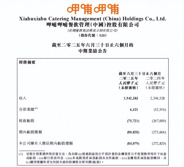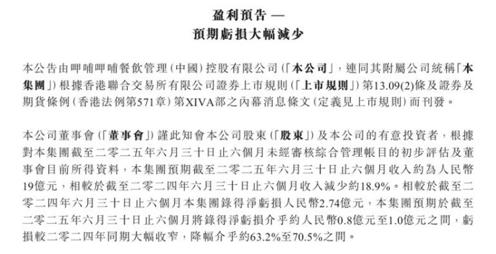 根据财报数据,2025年上半年,呷哺集团的营收是19.4亿,净亏损是0.8亿。从2021年至2025年这五年,累计亏损金额已达到13亿。