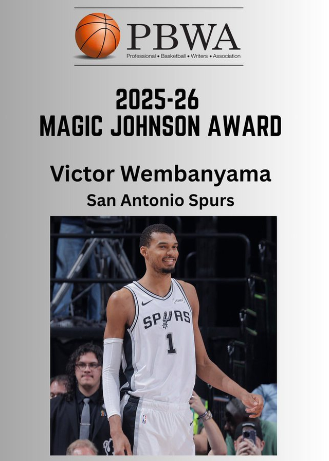 北京时间4月17日,美国职业篮球作家协会今日宣布,圣安东尼奥马刺队的维克托-文班亚马斩获2025-26赛季魔术师约翰逊奖。该奖项旨在表彰赛场表现出众,同时在对接媒体、对待球迷时兼具配合度与优雅风度的NBA球员。