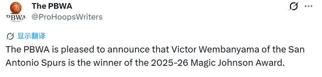 职业篮球作家协会会长霍华德-贝克表示:“维克托-文班亚马完美诠释了该奖项的核心精神。身为超级球星,他在场上统治力十足,场下同样思虑周全、谈吐风趣。他乐于分享、待人亲和,对记者耐心十足,愿意畅谈各类话题,从常规赛MVP争夺战、社会公平议题,到北极光等趣味内容无所不谈。正如协会一名成员所言,维克托是一位极具深度、深知言语力量的思考者。”